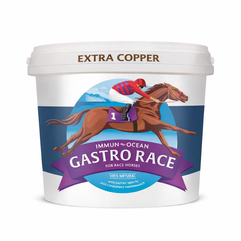 Immun-Ocean GASTRO RACE EXTRA COPPER is a daily multifactorial, all natural performance supplement expertly formulated to support the unique needs of racehorses.  This 100% natural formula combines Ascophyllum Nodosum and Lithothamnium, providing an ideal balance of vitamins, minerals and trace elements to support optimal digestive health and helps increase energy levels.